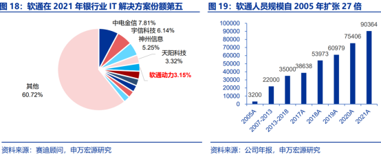 2021年在银行IT解决方案市占率3.15%。2005年软通动力成立之时,公司仅有3200人,2021年总人数达90364人,人员规模扩张27倍,佐证公司客户/订单数量持续提升。