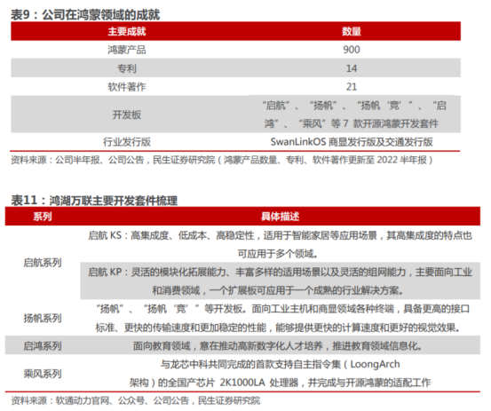 鸿湖万联子公司负责OpenHarmony相关业务,已推出八款开发板及模组、3款行业发行版及多个商用设备,完成全志、瑞芯微、龙芯等主流芯片代码适配。截至2022.6.30,鸿湖万联已接入SKU超过900款,覆盖400+合作伙伴。
