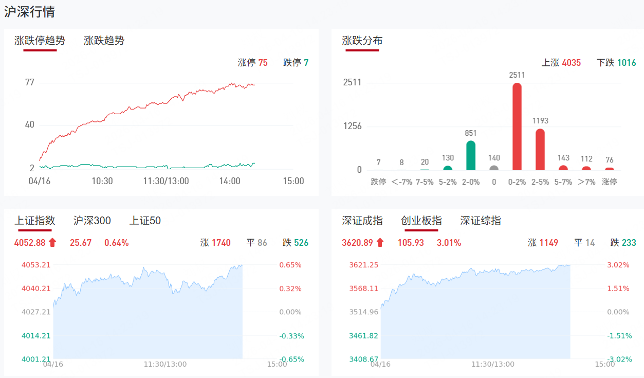 指数持续走强,创业板指拉升涨逾3%,沪指涨0.63%,深成指涨1.90%。算力租赁、电池、游戏传媒等方向涨幅居前,沪深京三市上涨个股近4300只,创业板指权重股宁德时代、中际旭创、新易盛、天孚通信等纷纷大涨。