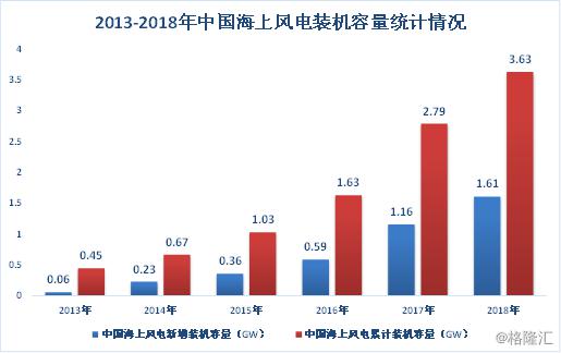 基于此,加之海上风电资源丰富,近年来我国海上风电装机容量显著上升。据前瞻产业研究,2013年我国海上风电新装机容量仅0.45GW,新装机容量也仅为0.06GW。截止至2018年底,中国海上风电新增装机容量达到1.61GW,累计装机容量达到3.63GW。