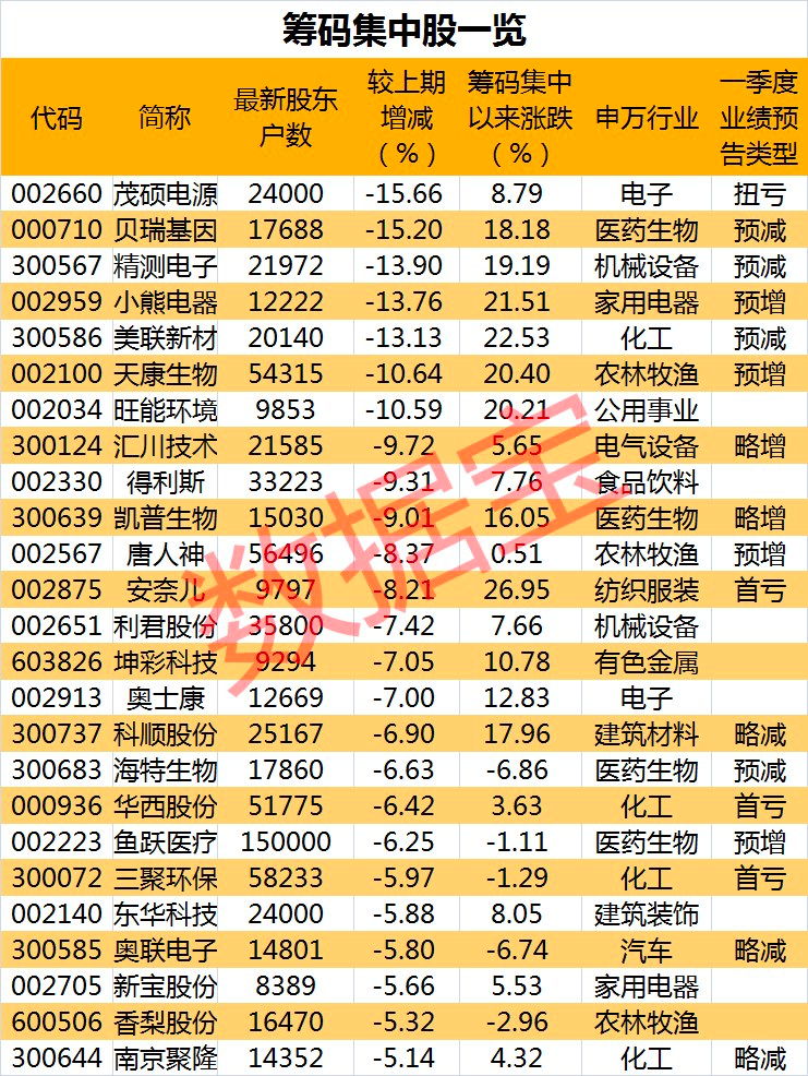 证券时报•数据宝统计显示,截至4月22日,剔除上市新股和st股,共有191只个股自4月10日后公布了最新一期的股东户数,与上期(4月10日)相比,股东户数下降的有107只。其中股东户数降幅超5%的有25只。