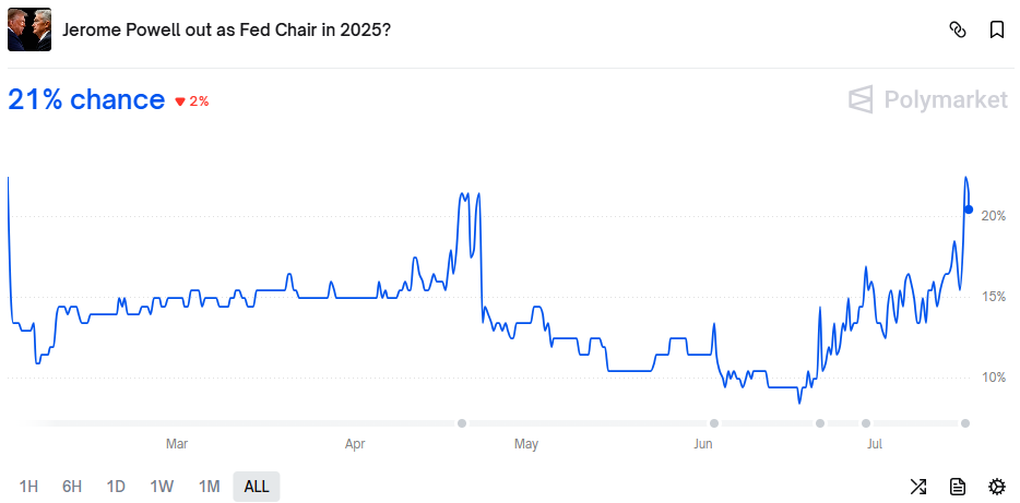 周三Polymarket平台的押注显示,交易员预计特朗普今年解雇鲍威尔的可能性一度达到约24%,这是自去年年底创建该押注以来的最高概率。