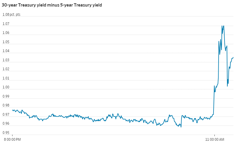 受此影响,美债收益率曲线在周一盘中迅速趋陡——30年期债券收益率与5年期债券收益率之间的差距一度达到103个基点,高于鲍威尔可能被解雇的首份报道之前的97个基点。
