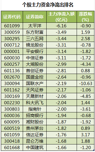此外,2860只个股被主力资金净卖出,其中,45股被主力资金净卖出超1亿元。主力资金净流出最多的个股是太平洋,净流出金额为6.16亿元;主力资金净流出居前的个股还有东方财富、三六五网、锦龙股份、平安银行、中信证券,净流出金额分别为3.49亿元、3.44亿元、3.31亿元、3.14亿元、3.11亿元。