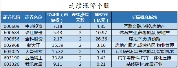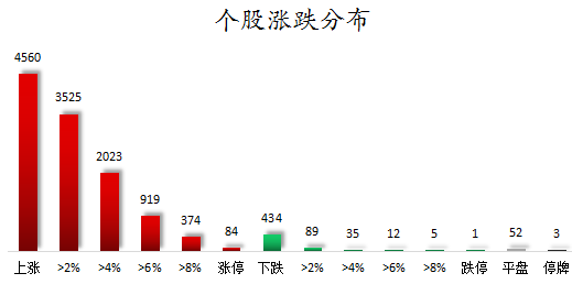 截至收盘,沪深两市合计4560只个股上涨,434只个股下跌,平盘个股52只,停牌的个股3只。不含当日上市新股,共有84只个股涨停,1只个股跌停。连续涨停天数看,中迪投资、珠江股份均已连收3个涨停板,连续涨停板数量最多。