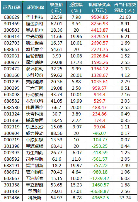 盘后龙虎榜数据显示,今日机构席位资金合计净卖出约2.09亿元。其中,净买入的个股18只,净卖出的个股11只。机构净买入最多的股票是华丰科技,净买入金额约9504.85万元;机构净买入的居前还有恒达新材、昊志机电、中光防雷、浙江世宝、盛邦安全等股。机构净卖出最多的股票是科沃斯,净卖出金额约4.97亿元;机构净卖出居前的还有盟固利、丰立智能、五洲新春等股。
