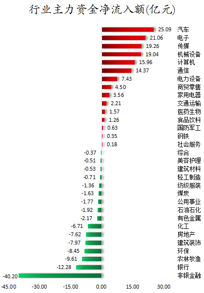 从行业板块来看,申万所属的31个一级行业,今日有15个行业板块主力资金呈现净流入,其中,汽车行业板块主力资金净流入最多,净流入金额25.09亿元;行业板块主力资金净流入居前的还有电子、传媒、机械设备、计算机、通信,净流入金额分别为21.06亿元、19.26亿元、19.04亿元、15.96亿元、14.37亿元。16个行业板块主力资金呈现净流出,其中,非银金融行业板块主力资金净流出最多,净流出金额为40.2亿元;行业板块主力资金净流出靠前的还有银行、农林牧渔、环保,净流出金额分别为12.28亿元、9.61亿元、8.45亿元。