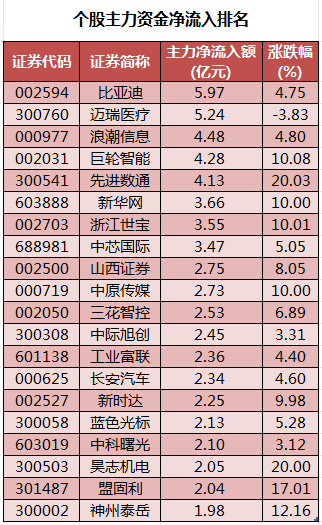 个股来看,今日有2182个股获主力资金净流入,其中,57股获主力资金净流入超1亿元。比亚迪获主力资金净流入最多,净流入金额为5.97亿元;主力资金净流入居前的个股还有迈瑞医疗、浪潮信息、巨轮智能、先进数通、新华网,流入金额分别为5.24亿元、4.48亿元、4.28亿元、4.13亿元、3.66亿元。