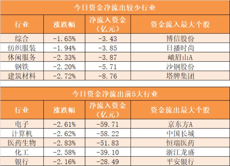 28个申万一级行业中,无一行业实现资金净流入,电子、计算机、医药生物、化工等行业资金净流出规模居前,其中电子行业净流出59.71亿元居首。