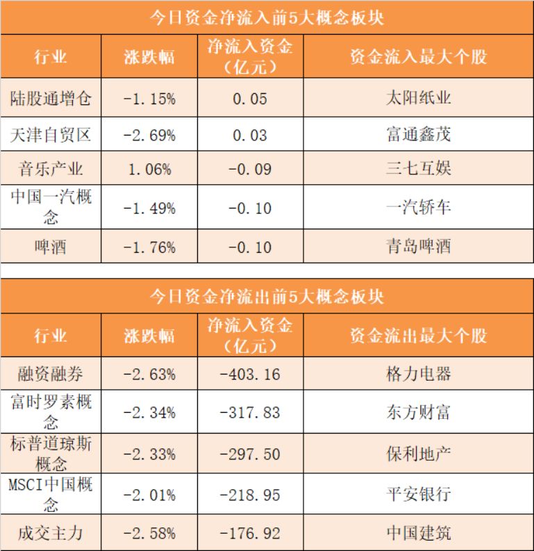 概念板块方面,今日陆股通增仓、天津自贸区概念板块资金呈现净流入,其中陆股通增仓概念净流入0.05亿元居首。