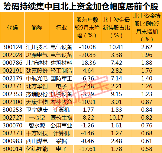 其中14股北上资金最新持股比例相较9月末增加超过0.5个百分点,汇川技术北上资金最新持股比例为10.41%,相较9月末持股比例增加2.62个百分点;思源电气的北上资金最新持股比例为3.38%,相较9月末增加1.96个百分点;其他增幅较大的还有北新建材、劲嘉股份、中航光电、北方华创和杰瑞股份,增幅都超过1个百分点。
