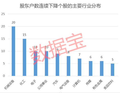 证券时报·数据宝统计显示,截止最新数据,两市共有142股连续2月筹码持续集中。分行业来看,142股分布在24个申万行业,扎堆出现在机械设备和化工行业中,分别有20只、15只。