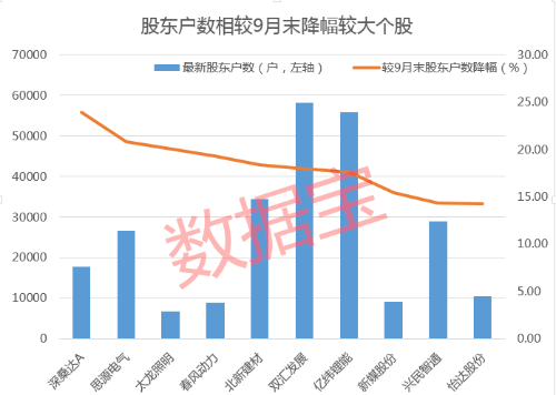 相较9月末股东户数,142股中有23只个股股东户数降幅超过10%。其中深桑达A最新一期股东户数为17802户,相较9月末减少23.92%;次之为思源电气、太龙照明,最新一期股东户数的降幅分别为20.83%和20.06%;其他股东户数降幅较大的还有春风动力、北新建材、双汇发展等。