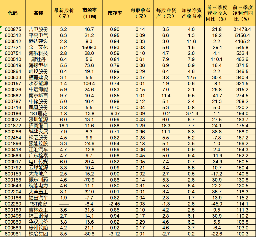 根据Chioce数据梳理,目前A股市场共有415只个股破净,其中,有35只个股前三季度净利润同比增速超过100%。