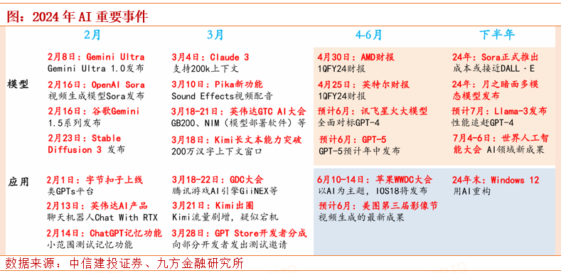 后续期待AI行业新进展,包括:GPT-5发布、Lama-3发布、Sora正式推出。