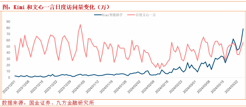 Kimi超越文心一言,成为周度访问量最高的国内AI应用。据SimilarWeb,从周度访问量看,Kimi最新周度(3/19-3/25)访问量394万,略高于文心一言的338万。从日度访问量看,3月25日访问量79万,环比上周同期增加94%,显著高于文心一言的56万。