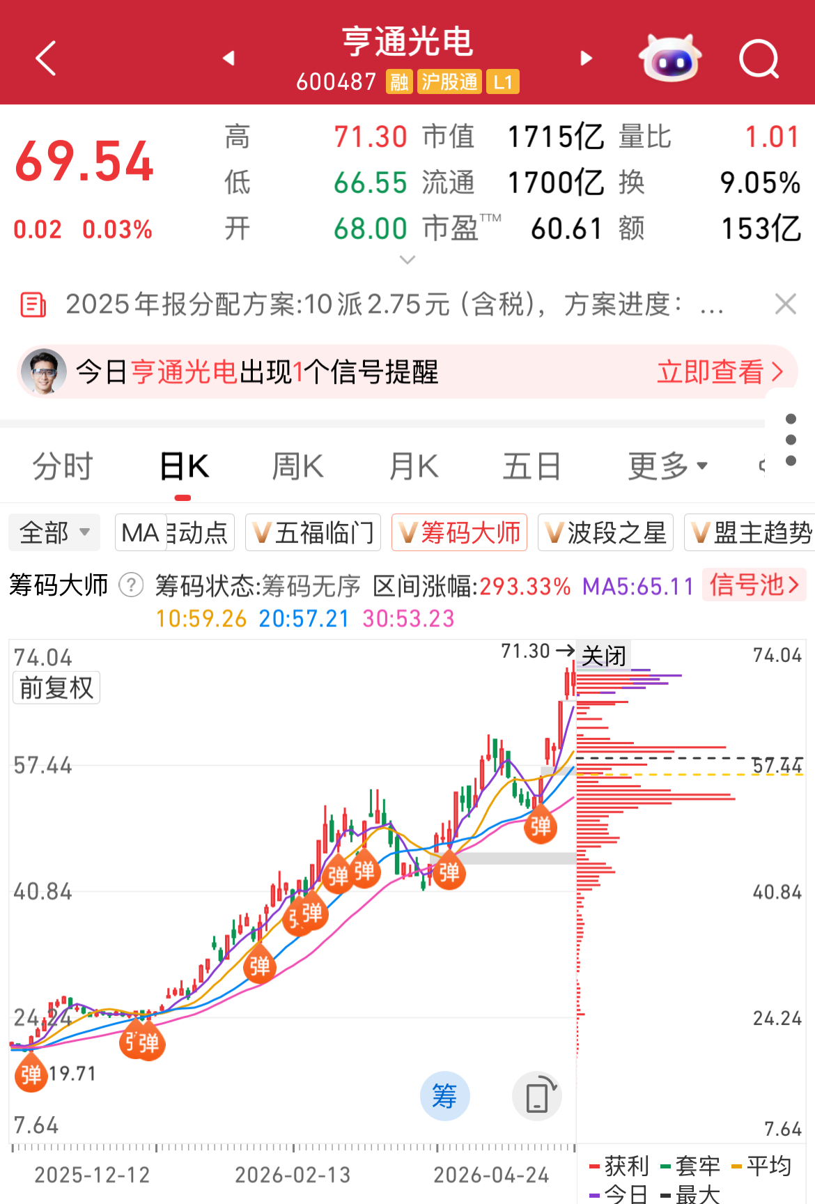 注:主升浪并非完全无迹可寻!“筹码大师”显示,亨通光电前期连续密集出现“弹”信号,1月14日出现信号后,正是开启主升浪,股价创历史新高,最近一次是4月17日出现信号,随后又是大幅上涨!那么,你的股有没有强势信号出现?还有哪些股出现了强势信号呢?更多学习案例参考,尽在“筹码大师”!点击详情>>