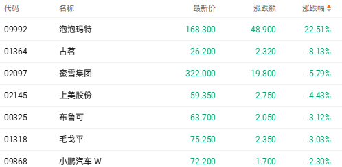 截至收盘,泡泡玛特(09992.HK)跌22.51%、古茗(01364.HK)跌8.13%、蜜雪集团(02097.HK)跌5.79%。