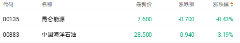 截至收盘,昆仑能源(00135.HK)跌8.43%、中国海洋石油(00883.HK)跌3.19%。