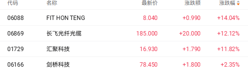 截至收盘,长飞光纤光缆(06869.HK)涨12.12%、汇聚科技(01729.HK涨11.82%、剑桥科技(06166.HK)涨2.35%。