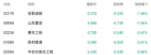 同期油气设备股也出现调整。截至收盘,百勤油服(02178.HK)跌7.46%、山东墨龙(00568.HK)跌7.06%、胜利管道(01080.HK)跌3.61%。