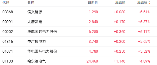 截至收盘,信义能源(03868.HK)涨6.61%、中广核电力(01816.HK)涨5.65%、华电国际电力股份(01071.HK)涨5.52%。