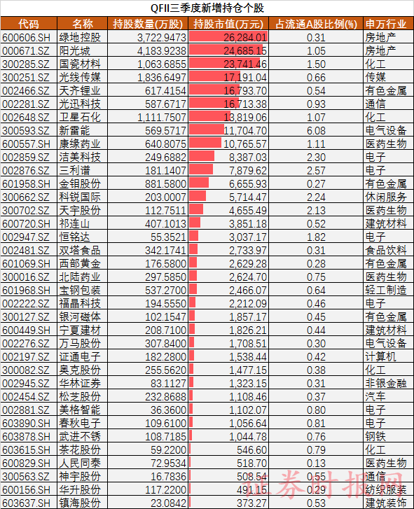 作为市场主力资金之一,外资的最新持仓数据也逐步揭晓。数据显示,截至目前,QFII三季度新增持仓36股。