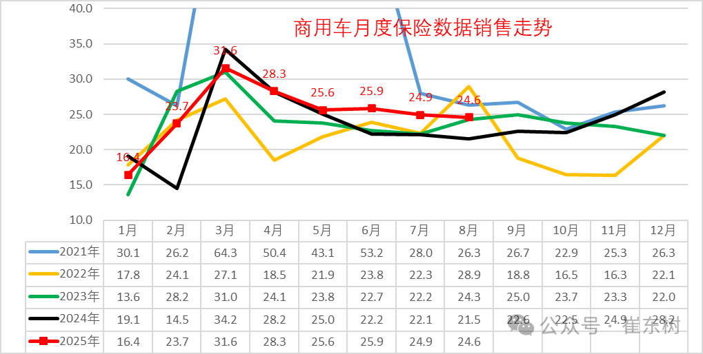 2025年商用车车市呈现1月的春节前置带来的2-8月的持续走强的走势特征。今年1月商用车月度数据环比下降较大,2月商用车销量23.7万台,属于历年的销量中位。3-4月商用车销量相对平稳,5-8月商用车受到新能源拉动走势较强,持续创出当月的近期历史新高。