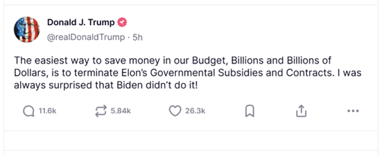 他在其自创的社交媒体平台Truth Social上写道,“省下数十亿美元预算最简单的办法就是终止马斯克的政府补贴和合同。我一直很惊讶拜登竟然没有这么做!”