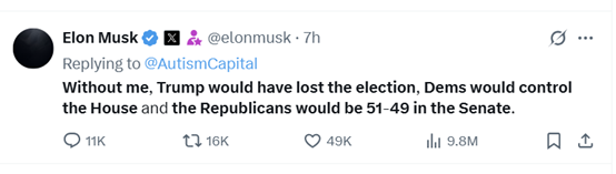 对此,马斯克在X上回击道,“随便吧”。他直言,“没有我,特朗普赢不了大选,众议院会被民主党控制,共和党在参议院也只会是51比49。”他还指责特朗普“忘恩负义”。