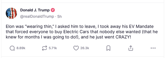 特朗普随后在Truth Social上回击马斯克,他写道:“埃隆‘快要失控了’,我让他离开,我取消了他的电动车强制令——那个强迫所有人购买没人想要的电动车的政策(他几个月前就知道我会这么做!)——然后他就彻底疯了!”