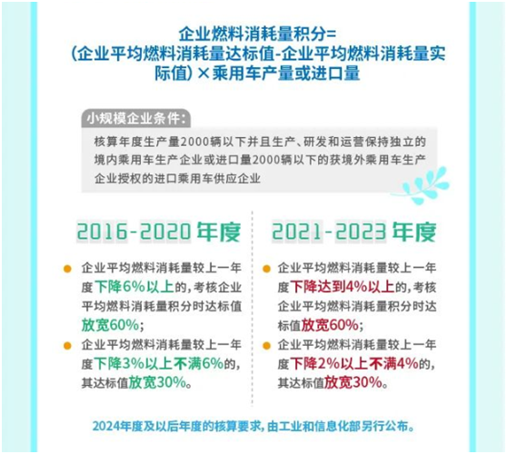 四是新增了低油耗乘用车在新能源汽车积分达标值核算时的优惠条款。对符合低油耗条件的传统能源乘用车,在核算企业新能源汽车积分达标值时,2021至2023年度低油耗乘用车的生产量或者进口量分别按照其数量的0.5倍、0.3倍、0.2倍计算。