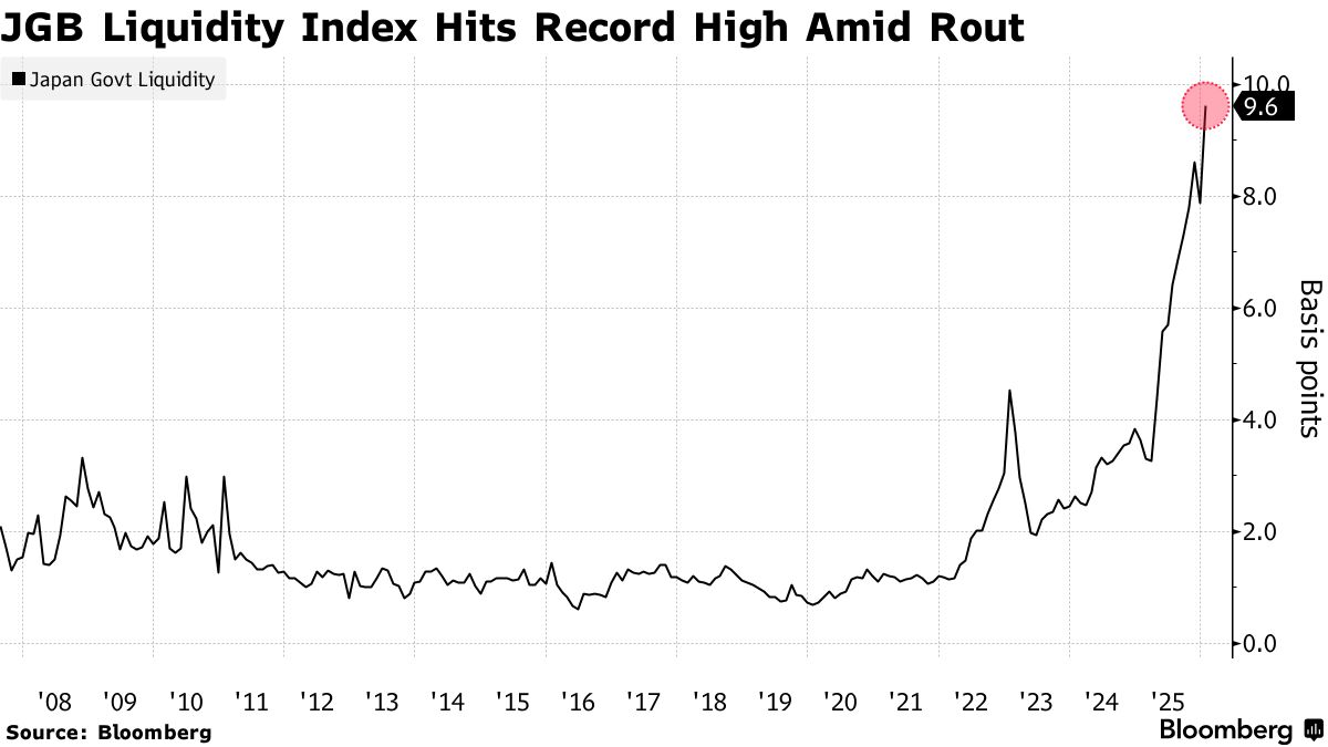 日本国债市场的流动性,在本周史诗级抛售潮中正恶化至历史最低水平,凸显出许多人认为的“买方罢工”现象,而这一现象正导致超长期国债收益率加速直线飙升。
