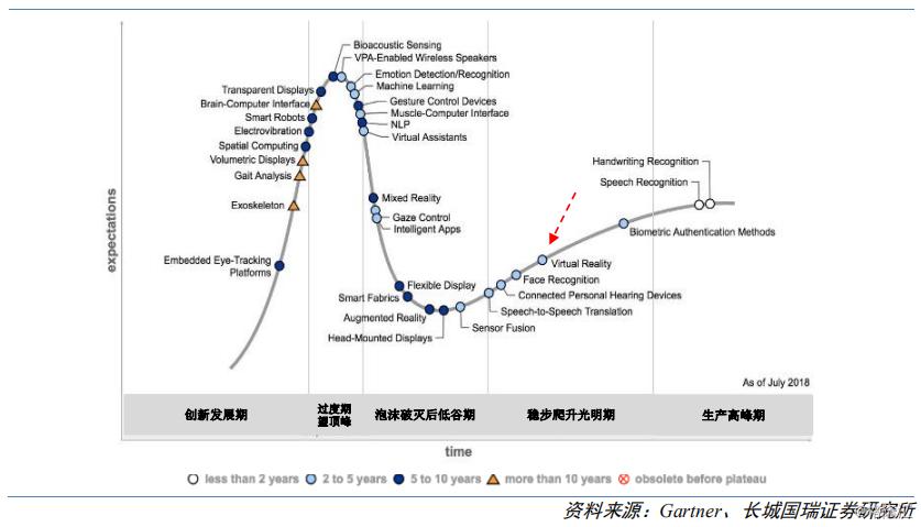 据Gartner统计,按产业成熟度划分,截至2018年7月,VR产业已出低谷,并处于“稳步爬升光明期”,有望在未来三年内进入生产高峰期。单就国内而言,其行业技术发展亦十分迅速,但整体产业成熟度仍未及国际水平。