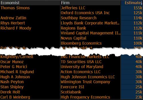 在主要华尔街投行中,对今晚非农数据给出的最低预测,来自High Frequency Economics预计的2.3万,最高预测则为杰富瑞预计的15.5万。值得注意的是,目前没有机构预测今晚非农会出现负增长。