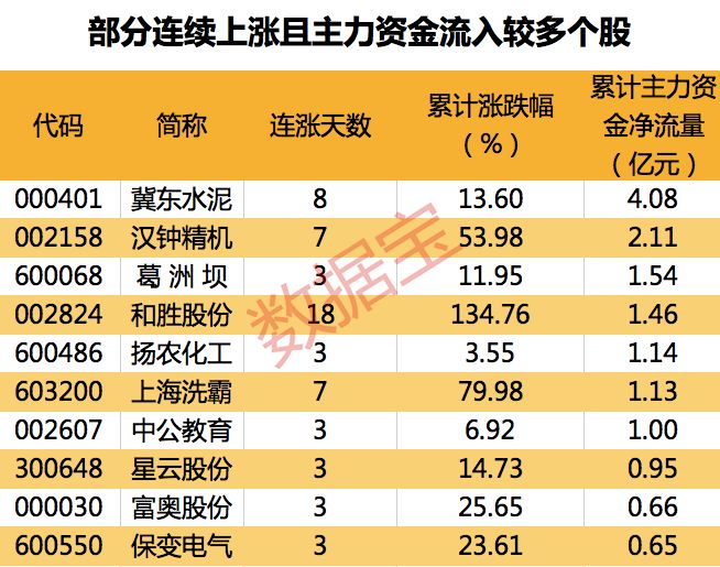 值得注意的是,50只连续上涨个股中,7只个股期间主力资金累计净流入超过亿元。其中,累计资金流入最多的为冀东水泥,主力资金累计流入4.08亿元。
