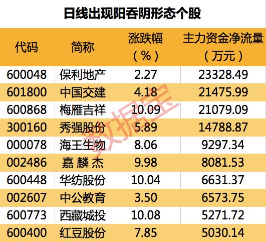 截至2月28日收盘,两市共有24只个股日K线出现阳吞阴形态,当天涨幅最大的是梅雁吉祥、西藏城投、华纺股份,涨幅分别为10.09%、10.08%、10.04%。