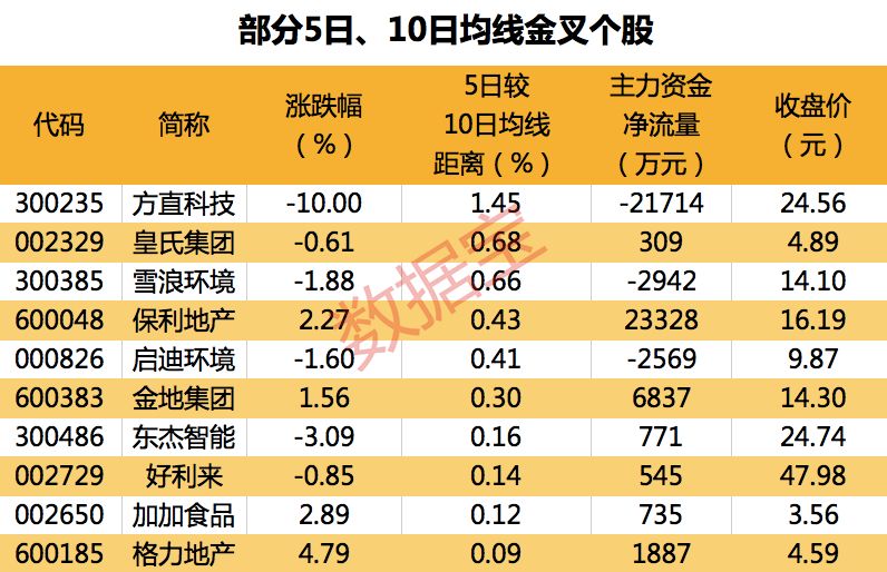 截至最新收盘,有13只A股的5日均线主动上穿10日均线,其中方直科技、皇氏集团、雪浪环境等个股的5日均线较10日均线距离最大,分别达1.45%、0.68%、0.66%。