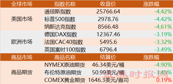 截至收盘,道指跌4.42%报25766.64点,标普500跌4.42%报2978.76点,纳指跌4.61%报8566.48点。道指创2018年2月以来最大单日跌幅;纳指创8年半以来的最大单日跌幅。标普500指数创2011年8月以来的最大单日跌幅。