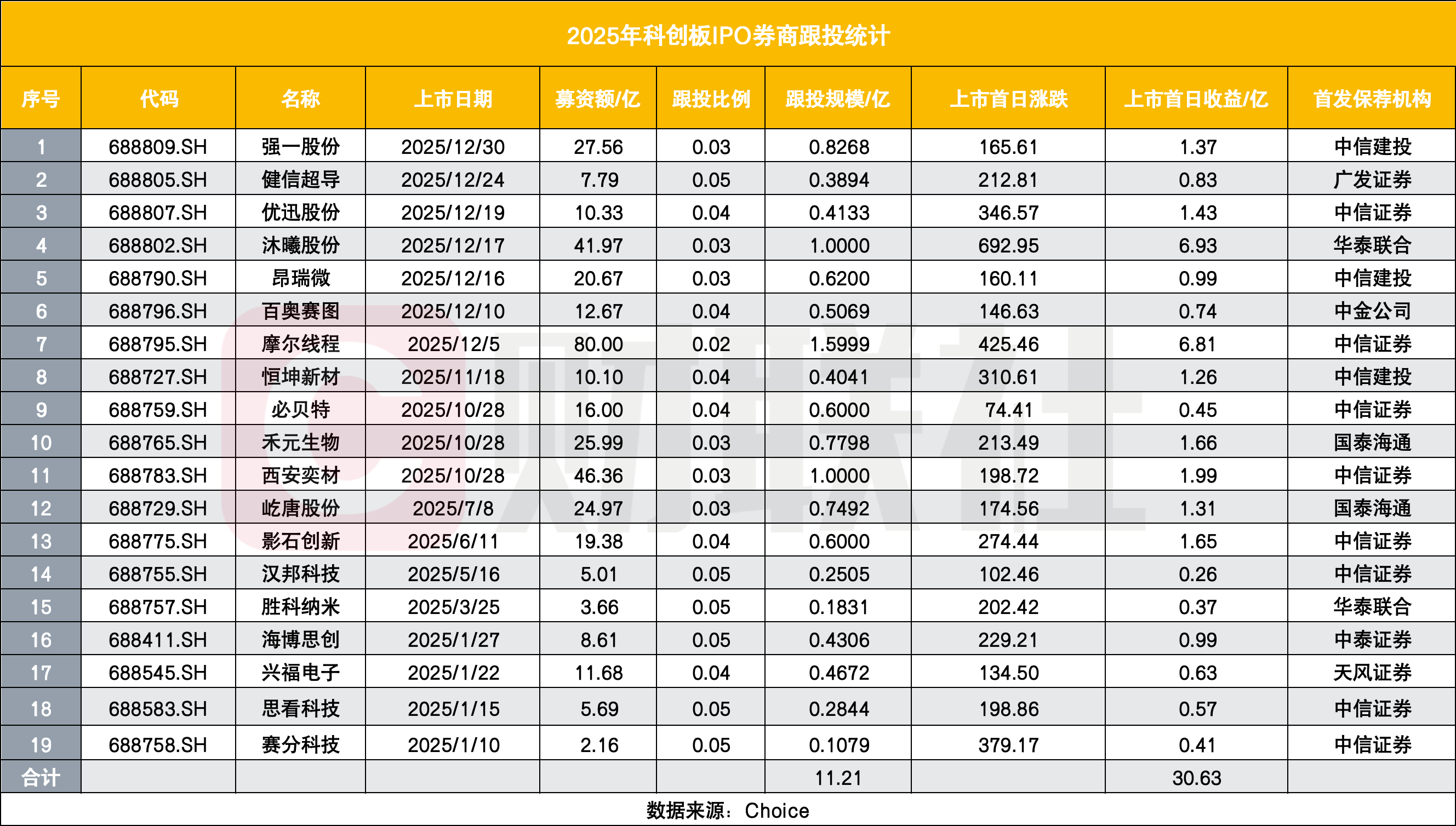 从单个项目来看,2025年科创板上市企业的跟投收益表现亮眼,多家企业上市首日为保荐券商带来超亿元收益。