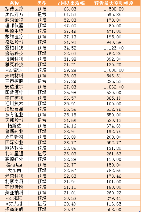 在业绩预增和扭亏的公司中,预告净利润最大变动幅度超过100%的公司里,7月以来,截至7月9日收盘,振德医疗、焦作万方、越秀金控分别涨66.05%、54.53%和52.83%居前。理邦仪器、明德生物、戴维医疗、盛弘股份、雷柏科技、金溢科技、博创科技、雅克科技等涨幅超过30%。