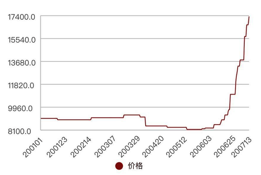 据百川盈孚,7月14日,国内PVC糊树脂手套料价格已涨至17348元/吨,一个多月的涨幅已超110%。而此前5年,这种化工原料的价格一直在7000元至9000元之间平稳波动。