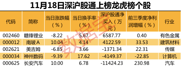统计显示,11月18日龙虎榜上榜个股中,5只个股前五大买卖营业部中出现深股通或沪股通的身影,净买入的有赣锋锂业、南玻A等,净买入金额为6587.77万元、4122.59万元。净卖出的有长安汽车、神州数码、美吉姆等,净卖出金额为11424.23万元、4149.37万元、1371.34万元。