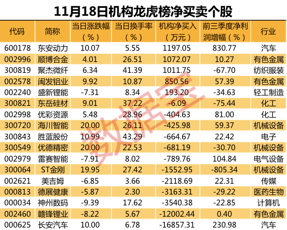 蛋壳公寓涨幅惊人,A股超大单资金流入也有动向。证券时报•数据宝统计显示,剔除新股,11月18日机构专用席位现身17只个股龙虎榜,合计净卖出4.18亿元,为连续第6日净卖出。个股来看,净买入5只,净卖出12只。