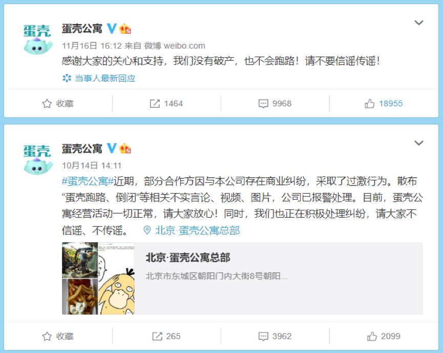 11月份以来,蛋壳公寓风波不断,北京市场出现大量业主、租客、供应商集中维权的现象,“欠债、倒闭、跑路”传闻不断发酵。11月14日,蛋壳公寓在官方微博上表示这些仅仅是合作方因为商业纠纷而采取的过激行为,并在16日回应称“我们没有破产,也不会跑路”。