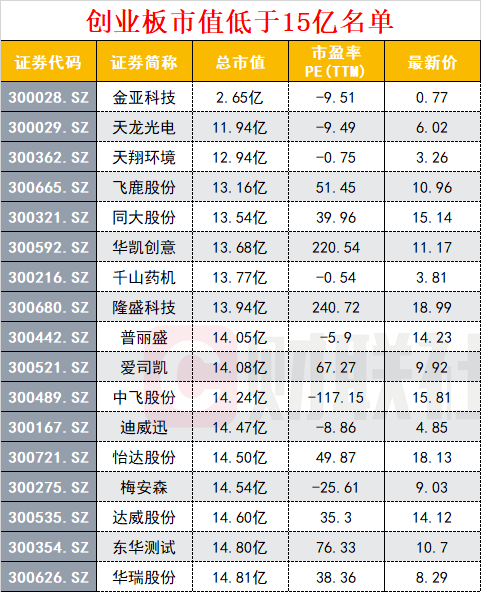 财联社梳理发现,创业板中市值低于15亿的共有17家上市公司。分别为金亚科技、天龙光电、天翔环境、飞鹿股份、同大股份、华凯创意、千山药机、隆盛科技、普丽盛、爱司凯、中飞股份、迪威迅、怡达股份、梅安森、达威股份、东华测试、华瑞股份。