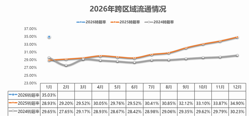 1月份,二手车转籍率为35.03%,环比上月增长0.14个百分点,同比去年同期增长6.1个百分点。二手车转籍总量为60.58万辆,较去年同期增长43.3%。