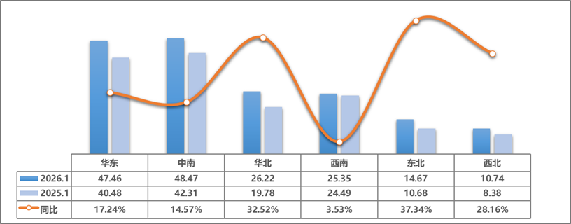 2026年1月,全国二手车市场交易量与去年同期相比,显现出较为显著的增长趋势,各地区的交易量均实现了不同程度的上扬。其中,北部地区的市场整体表现要优于南部地区,特别是华北和东北地区同比涨幅均超过30%。