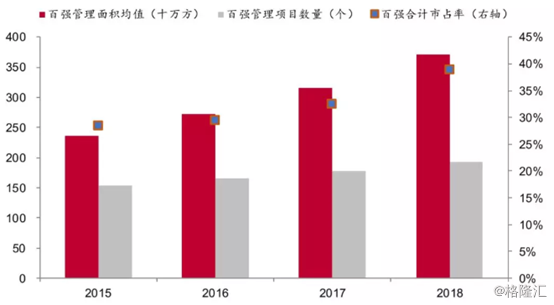 2015-2018年,物业百强管理面积均值由2361.5万方增长至3718.1万方,平均管理项目数量由154个增长至192个,市占率由28.42%提升至38.85%。2018年,TOP10的合计市占率提升至11.35%,较2017年增加0.29%。