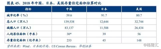 据华创证券预测估算,2018年我国存量住宅面积253亿平米,对应美国、日本存量住宅居住面积分别约为148亿平米、45亿平米,目前我国存量市场分别是美日的1.7倍和5.6倍。